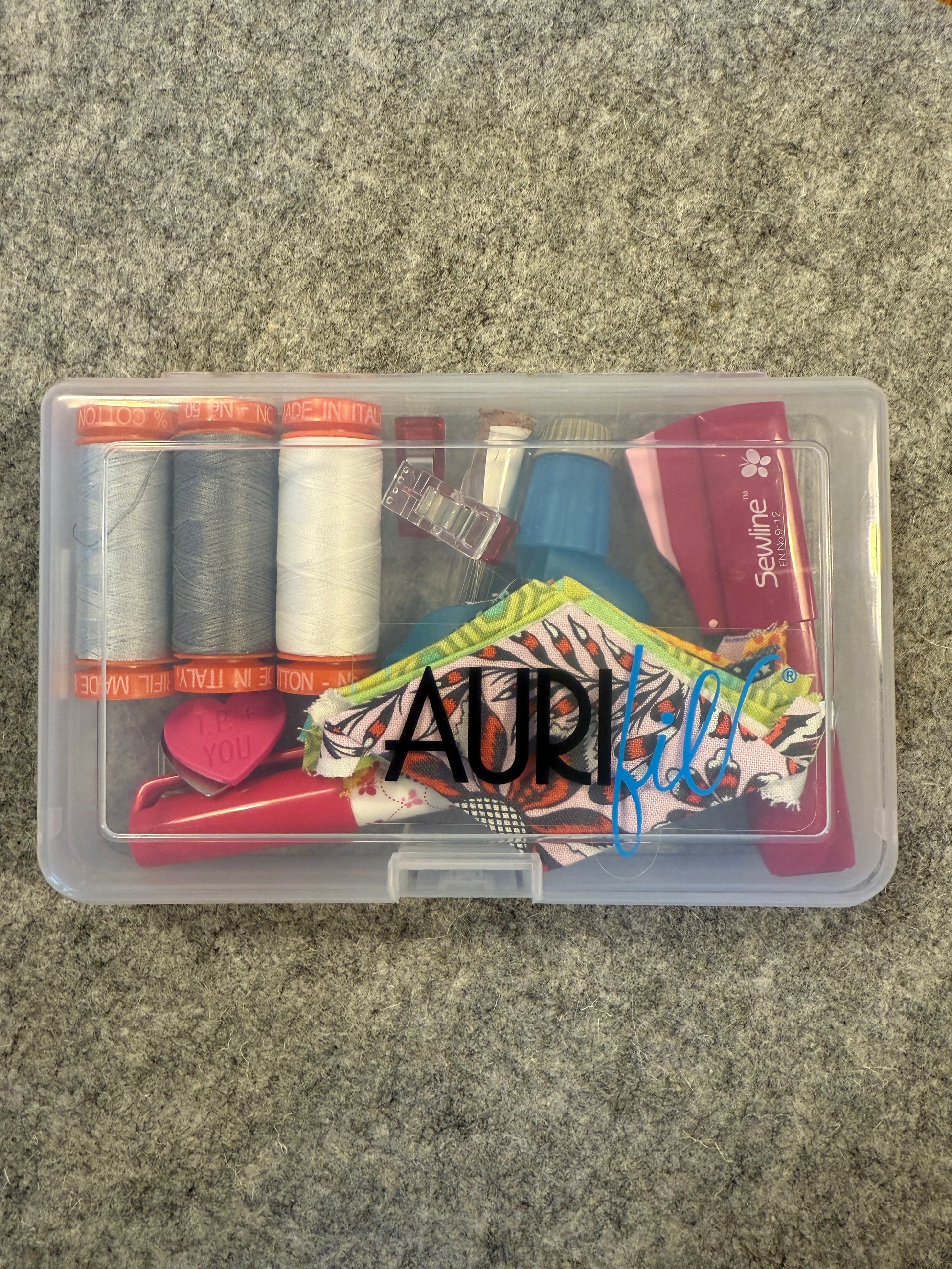 Endlich gibt es auch eine Box von Aurifil in welcher die kleine Spulen sicher und Staubgeschützt aufbewahrt werden können. Die Box ist aus dem gleichen hochwertigen und transparenten Kunststoff wie die Boxen für die "großen" Spulen und trägt auch das Aurifil Logo. Sie kann bis zu 10 kleine Spulen aufnehmen, aber auch ideal mit dem Zubehör für EPP unterwegs bestückt werden.
