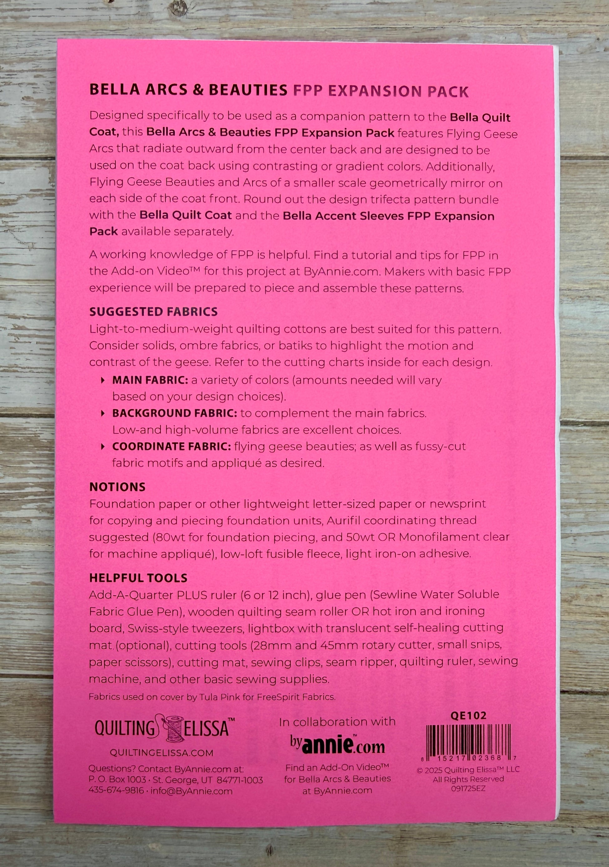 Mit dieser Ergänzungspackung zum Bella Quilt Coat von Quilting Elissa in Collaboration mit ByAnnie kann das Schnittmuster "Bella Quilt Coat" , mit dessen Hilfe sich endlich jeder eine Jacke quilten kann, um Bögen in der Flying Geese Methode mittels FPP erweitert werden. Damit wird Ihre Patchwork-Quilt Jacke zu einem richtigen Hingucker. Diese Bögen können dann in der Rückseite und/oder der Vorderseite derJacke genutzt werden.
