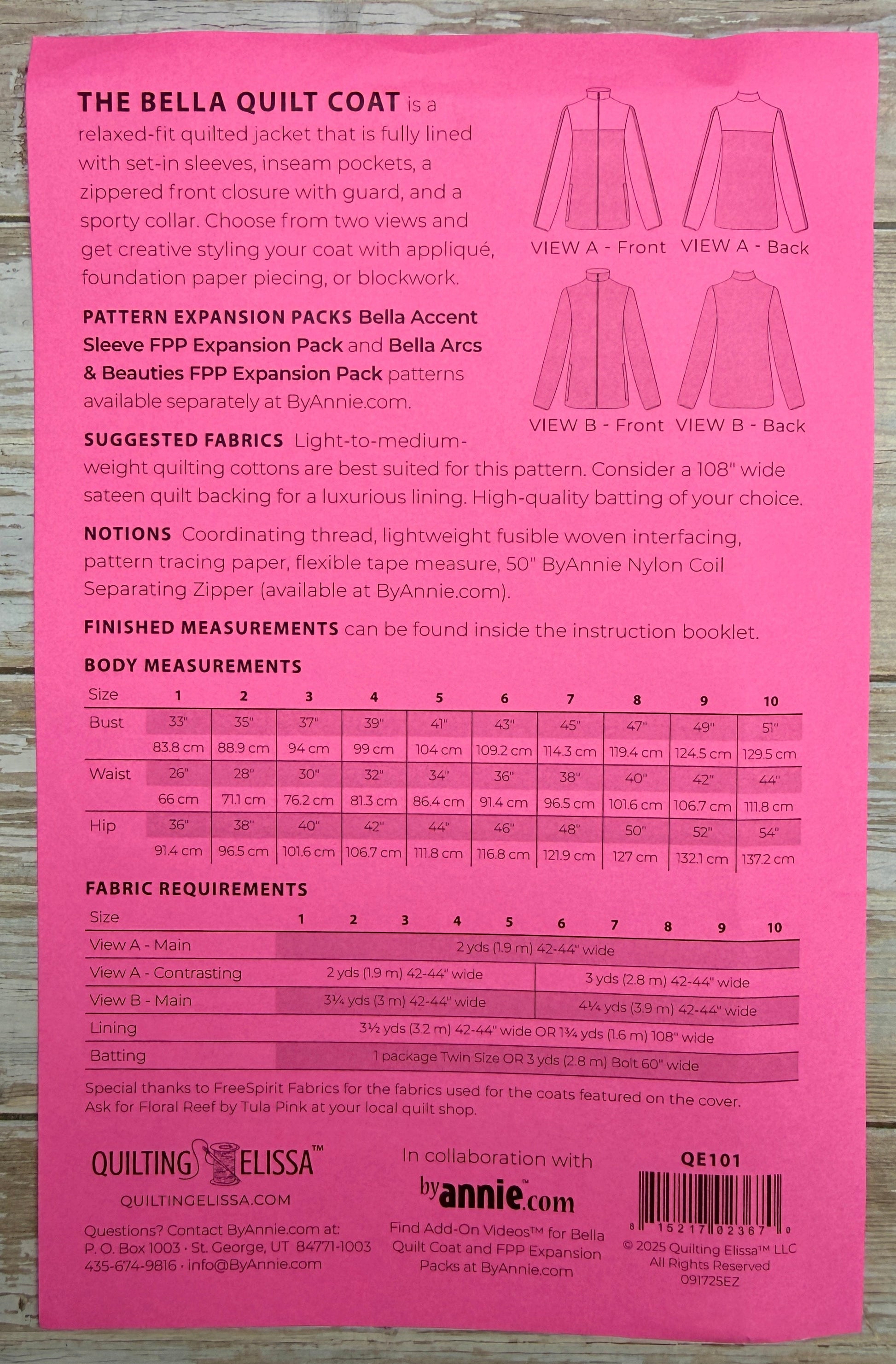 Der Bella Quilt Coat von Quilting Elissa in Collaboration mit ByAnnie ist Schnittmuster, mit dessen Hilfe sich endlich jeder eine Jacke quilten kann. So kann ein Quilt endlich getragen werden. Sie können sich damit eine gefütterte Patchworkjacke in 10 verschiedenen Größen nähen.