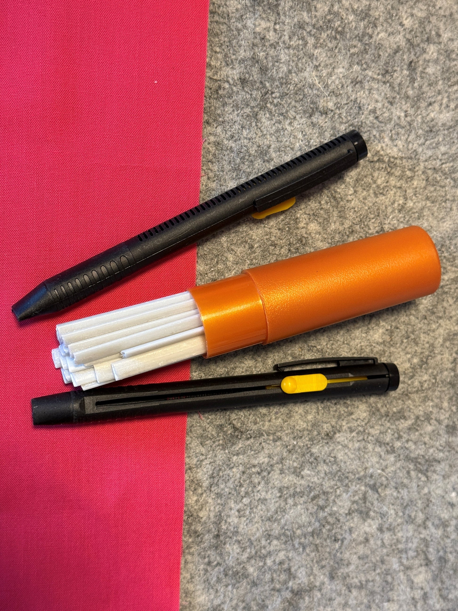 Zum Paket gehören zwei einfache Kunststoffhülsen, ähnlich wie bei Bastelmessern. Dort wird von oben eine der 20 Minen eingeschoben welche ebenfalls zum Angebot gehören und mit leichtem Druck in der Hülse fixiert. Danach kann markiert werden ob mit Hilfsmittel wie Lineal, Schablone oder ohne. Wenn die Markierung nicht mehr benötigt wird, einfach mit Dampf auf Stufe 2-3 wegbügeln und gut. Ich finde es genial und das zu dem Preis.