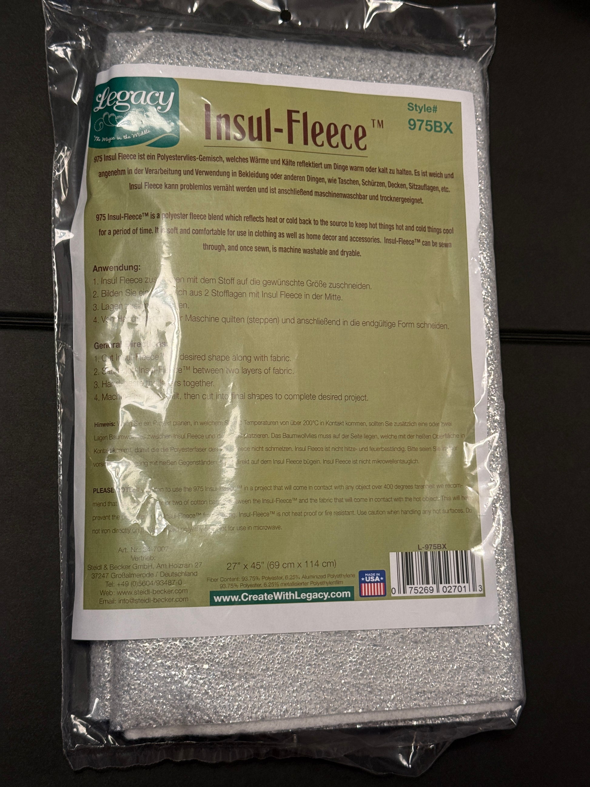 Das Legacy L-975 Insul-Fleece besteht aus Polyesterfasern, und einer Aluminumbeschichtung. Es ist weich und angenehm in der Verarbeitung. Es kann sowohl in Kleidung als auch in Projekten, wie z. B. Sitzkissen, Topflappen, Schlafsäcke, Spieldecken und mehr verwendet werden. Es kann problemlos durchgenäht werden und ist nach dem Nähen maschinenwaschbar und trocknergeignet. Kurz gesagt es hält heiße Dinge länger heiß und kalte Dinge länger kalt.