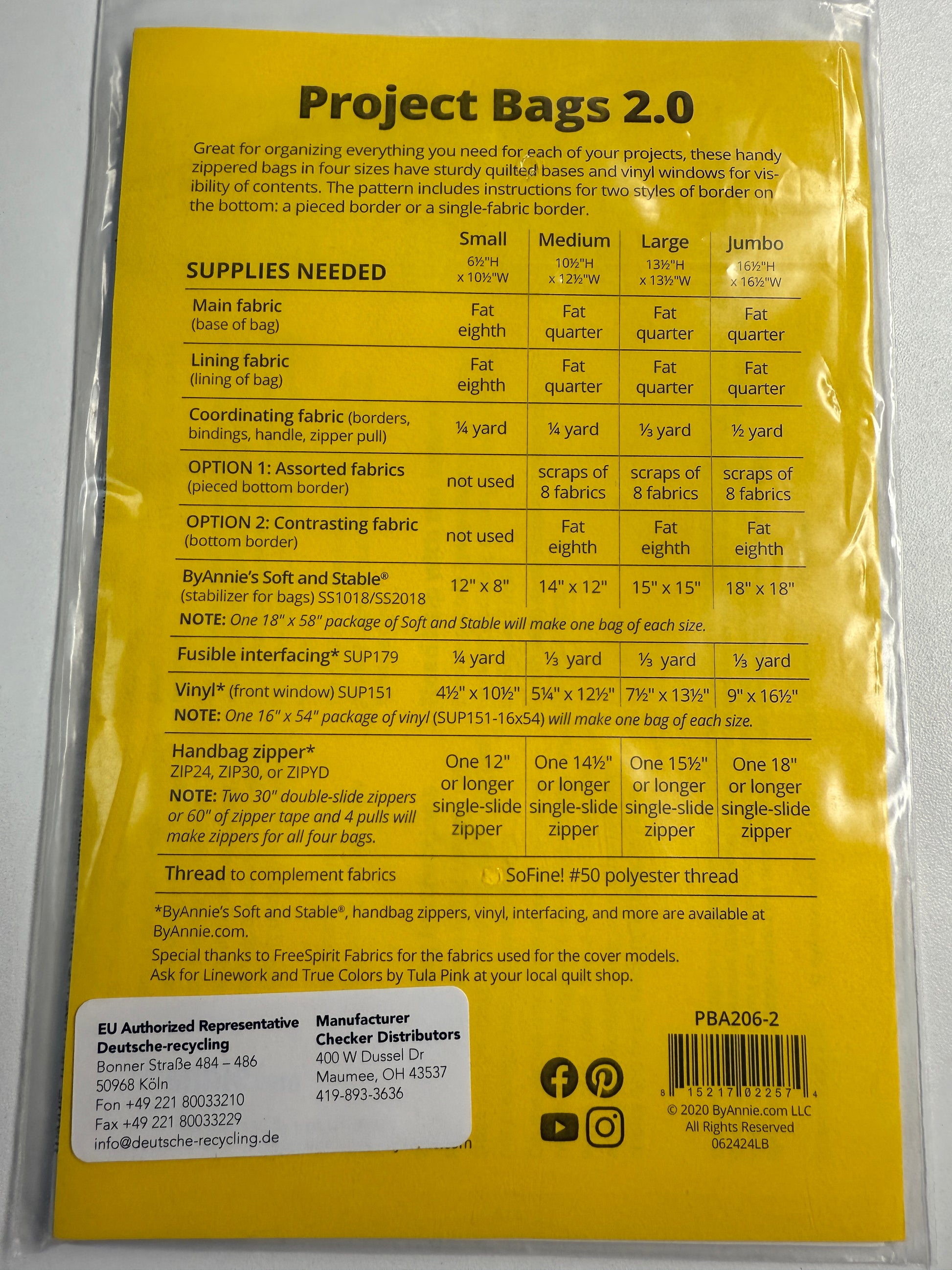 Sie erhalten das Papier-Schnittmuster für die Tasche Project Bags 2.0 von „By Annie“. Die Tasche welche in vier verschiedenen Größen genäht werden kann, hat einen Reißverschluss und eine Vinylfront durch welche man sehen kann, welches Projekt sich in der Tasche befindet.