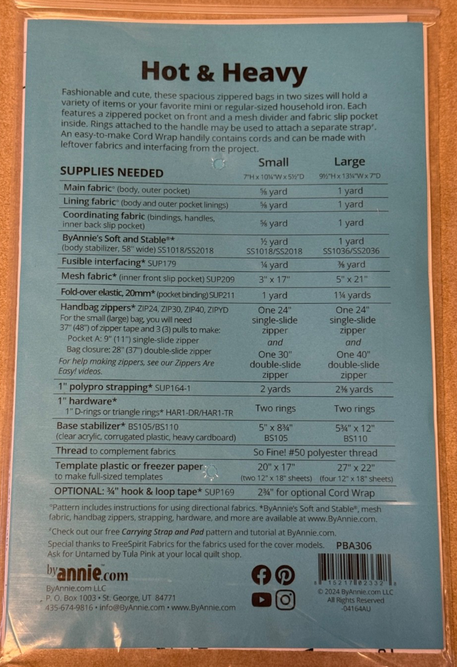 Sie erhalten das Papier-Schnittmuster für die Tasche Hot 6 Heavy von „By Annie“. Die Tasche dient der Aufbewahrung und dem Transport eines Bügeleisens oder Mini-Bügleisens z.B. zu einem Nähkurs oder Nähtreffen.....